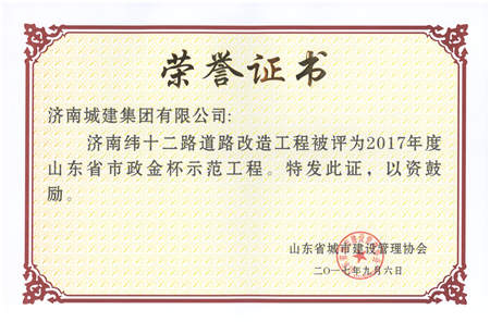 济南纬十二路道路改造工程被评为2017年度年度山东省市政金杯示范工程