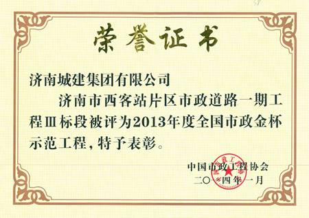 济南市西客站片区市政道路一期工程一标段被评为2013年度全国市政金杯示范工程