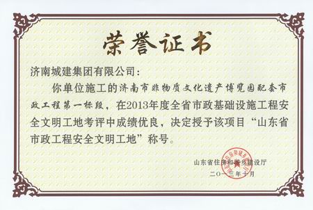 济南市非物质文化遗产博览园配套市政工程第一标段荣获2013年度山东省市政工程安全文明工地称号