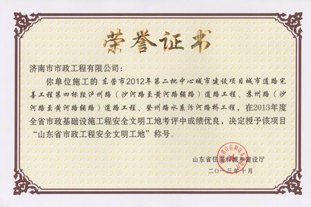 东营市2012年第二批中心城市建设项目城市道路完善工程第四标段泸州路道路工程、苏州路道路工程、登州路水系汾河路桥工程荣获2013年度山东省市政工程安全文明工地称号