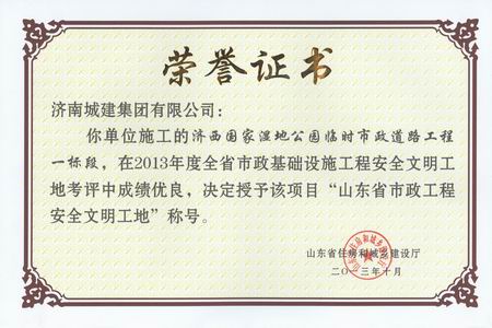 济西国家湿地公园临时市政道路工程一标段荣获2013年度山东省市政工程安全文明工地称号