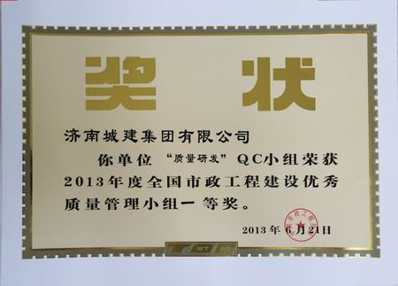 “质量研发”QC小组荣获2013年度全国市政工程建设优秀质量管理小组一等奖